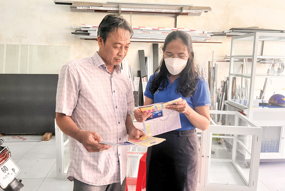 Nhân viên tổ chức dịch vụ thu BHXH, bảo hiểm y tế ở quận Bình Thủy tuyên truyền, vận động người dân tham gia.