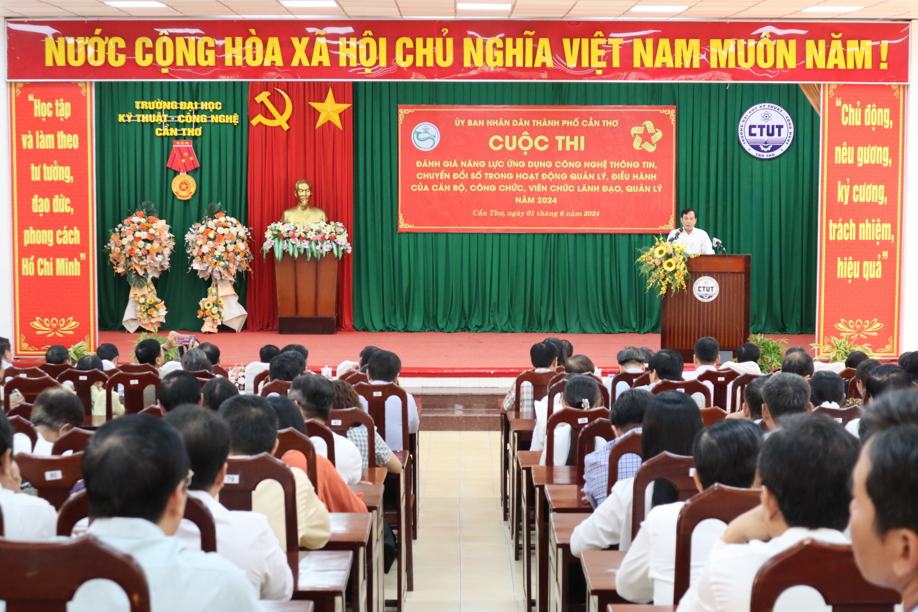 Thực hiện Kế hoạch 248/KH-UBND ngày 14 tháng 12 năm 2023 của Ủy ban nhân dân thành phố Cần Thơ Tổ chức Cuộc thi Đánh giá năng lực ứng dụng công nghệ thông tin (CNTT), chuyển đổi số (CĐS) trong hoạt động quản lý, điều hành của cán bộ, công chức, viên chức lãnh đạo, quản lý năm 2024. Sáng nay ngày 01/6, tại Trường Đại học Kỹ thuật - Công nghệ Cần Thơ đã diễn ra buổi lễ Khai mạc cuộc thi “Đánh giá năng lực ứng dụng công nghệ thông tin (CNTT), chuyển đổi số (CĐS) trong hoạt động quản lý, điều hành của cán bộ, công chức, viên chức lãnh đạo, quản lý năm 2024” của thành phố Cần Thơ. Đến dự và phát biểu khai mạc có ông Nguyễn Ngọc Hè, Thành ủy viên, Phó Chủ tịch UBND thành phố Cần Thơ.